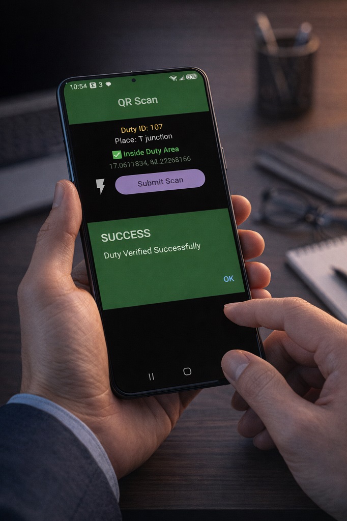 Smart QR-based verification combined with GPS geo-fencing technology to create virtual checkpoints for security guards, staff monitoring, and real-time field verification.